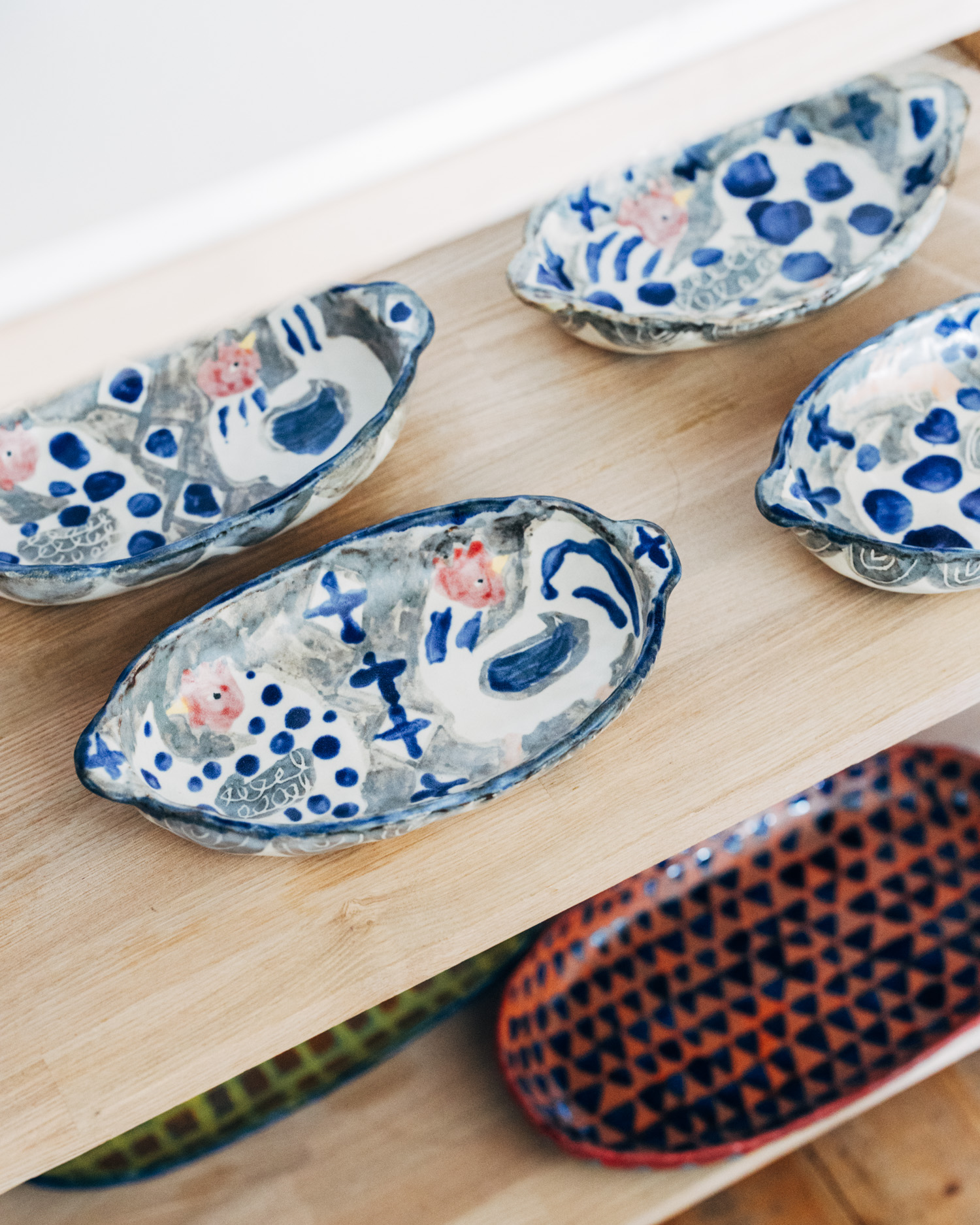 色の異なる粘土を組み合わせて模様を描く「練り込み技法」を用いて作陶しています。金太郎飴のようにうつわの表裏に模様が現れるのが特徴です。