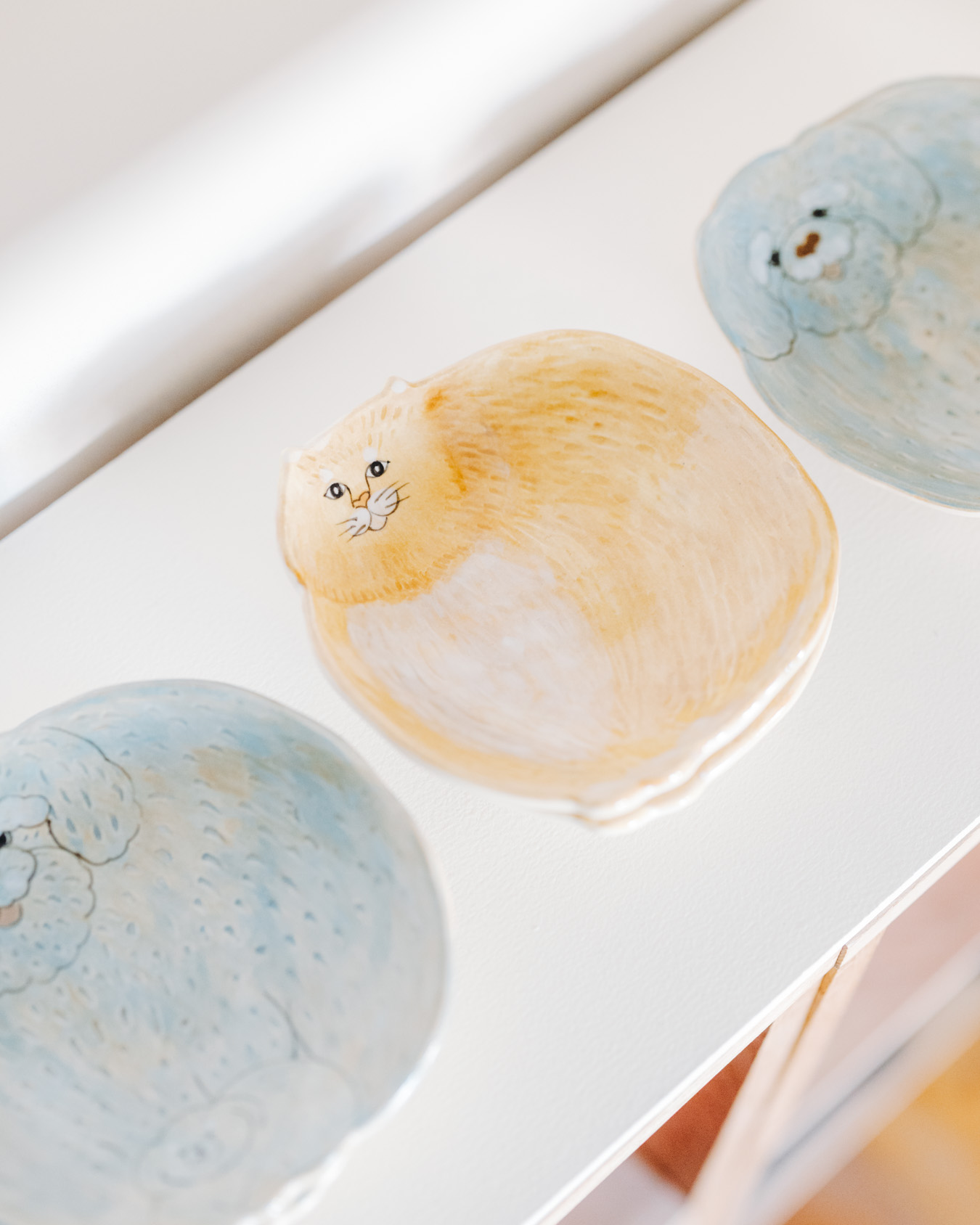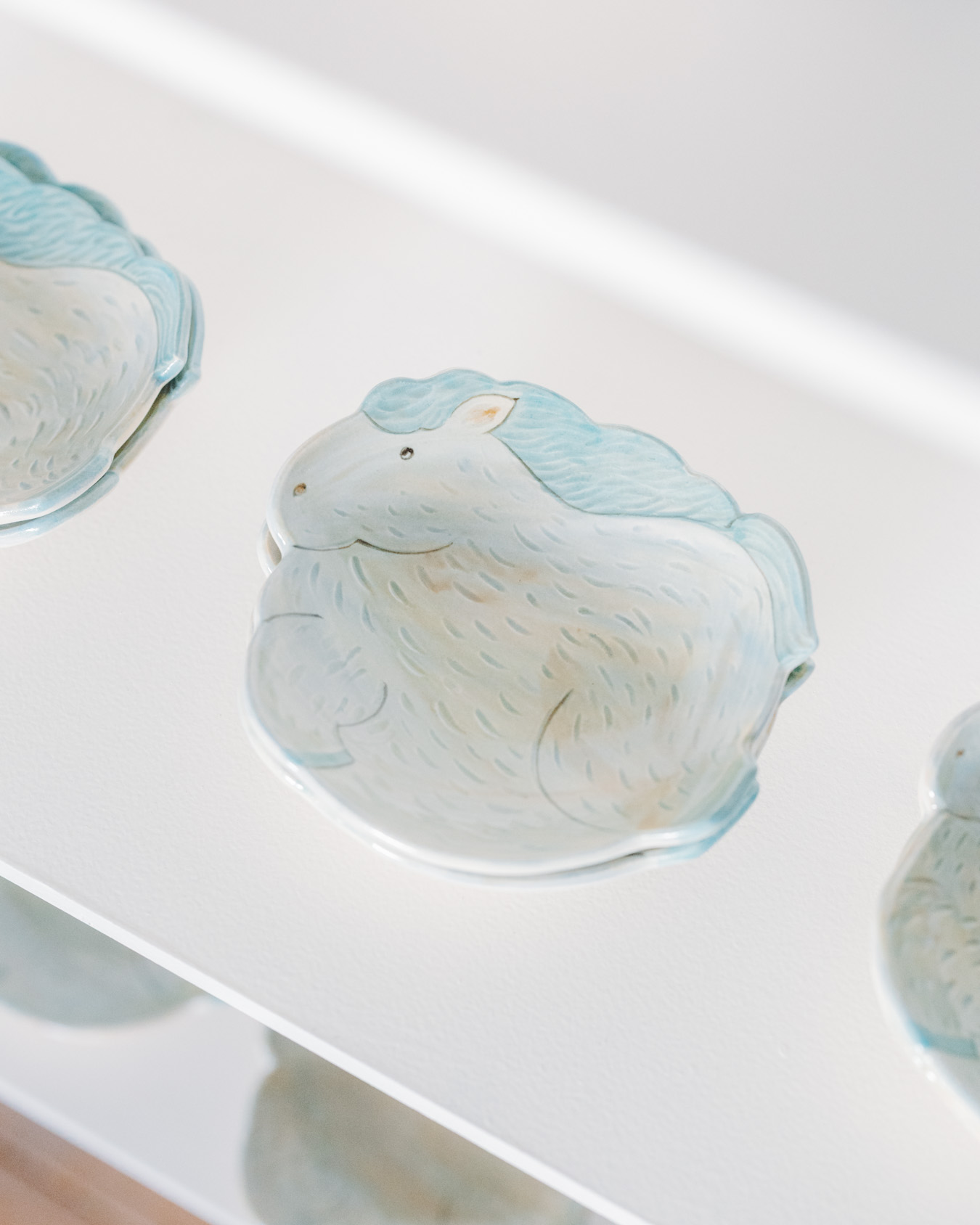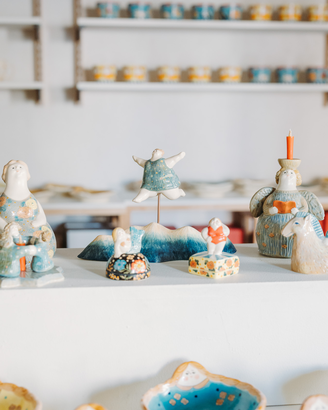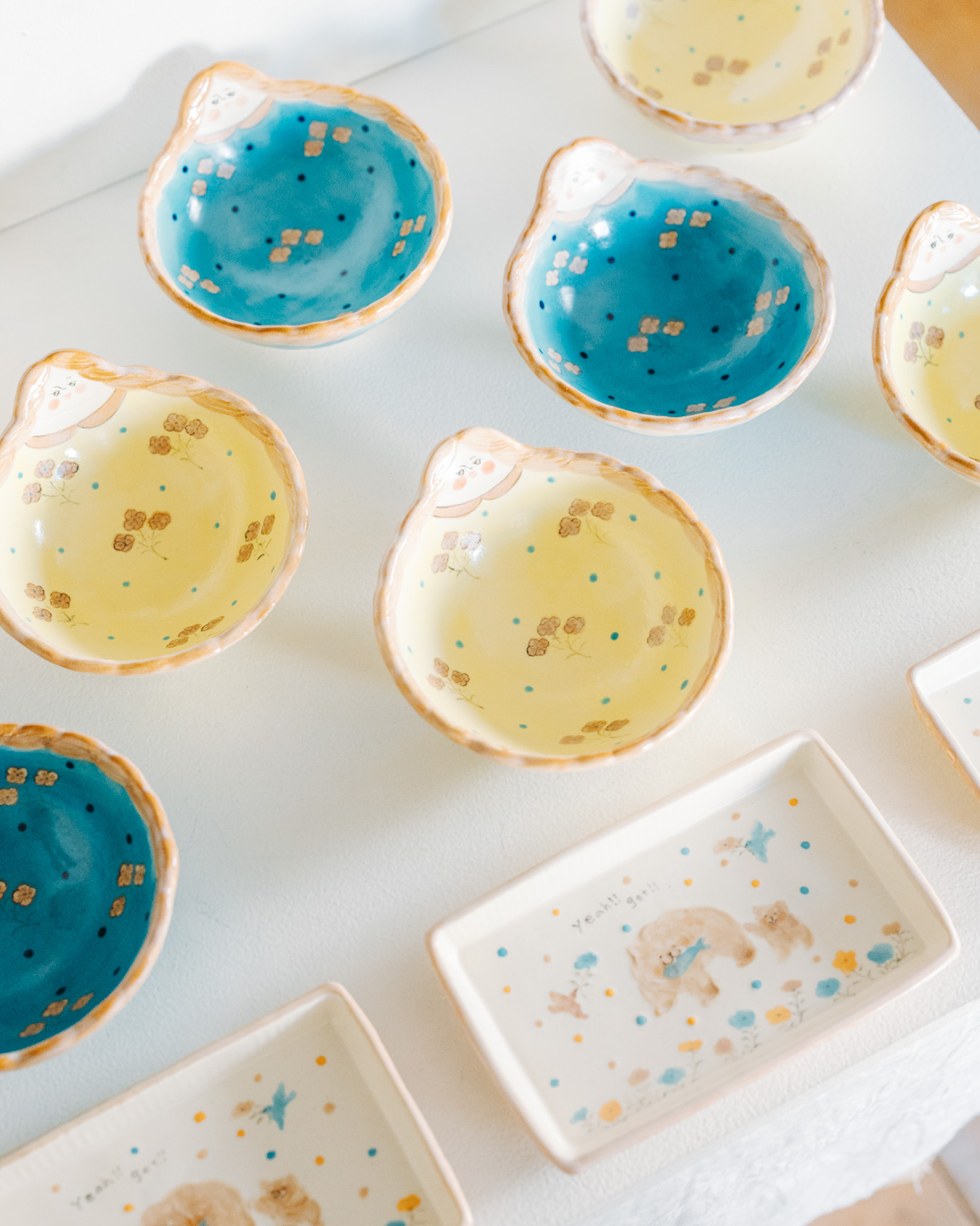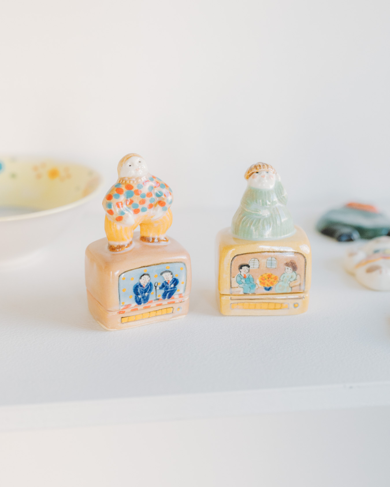やさしさとユーモアにあふれたオブジェ、お皿、小箱などが並び、