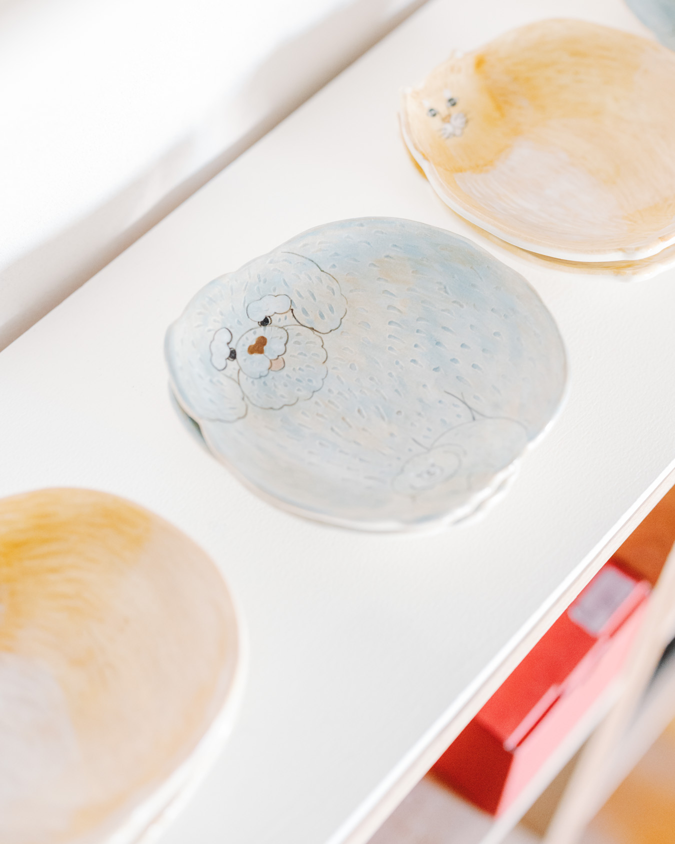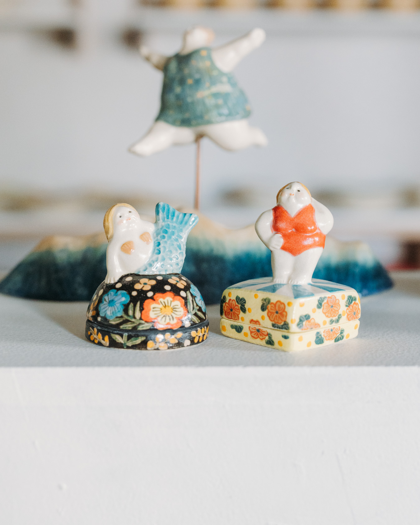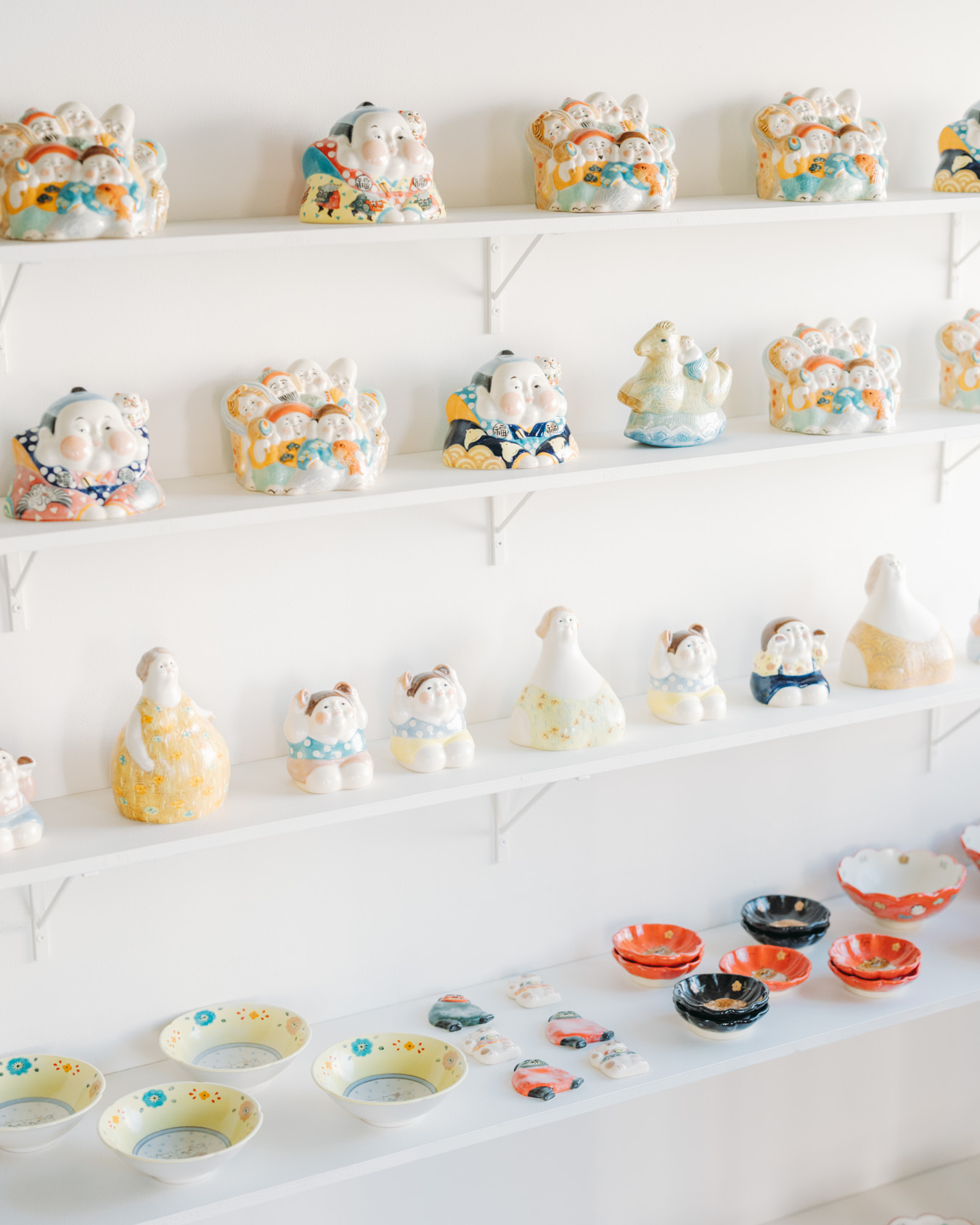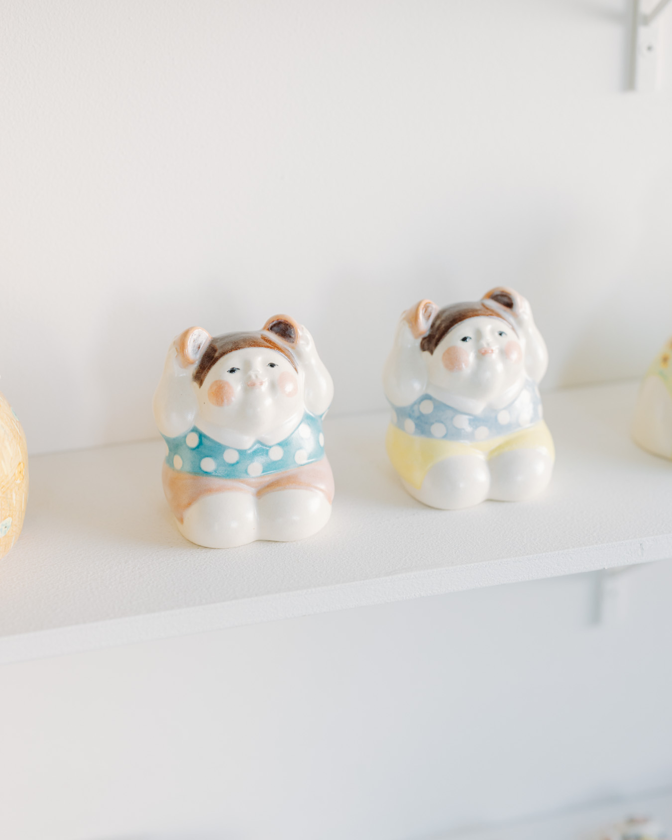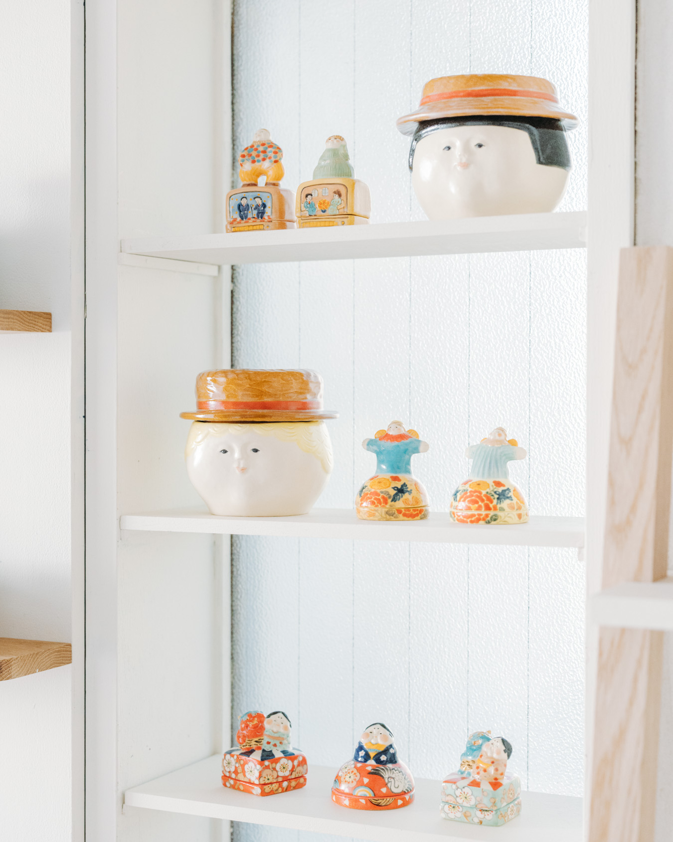 やさしさとユーモアにあふれたオブジェ、お皿、小箱などが並び、