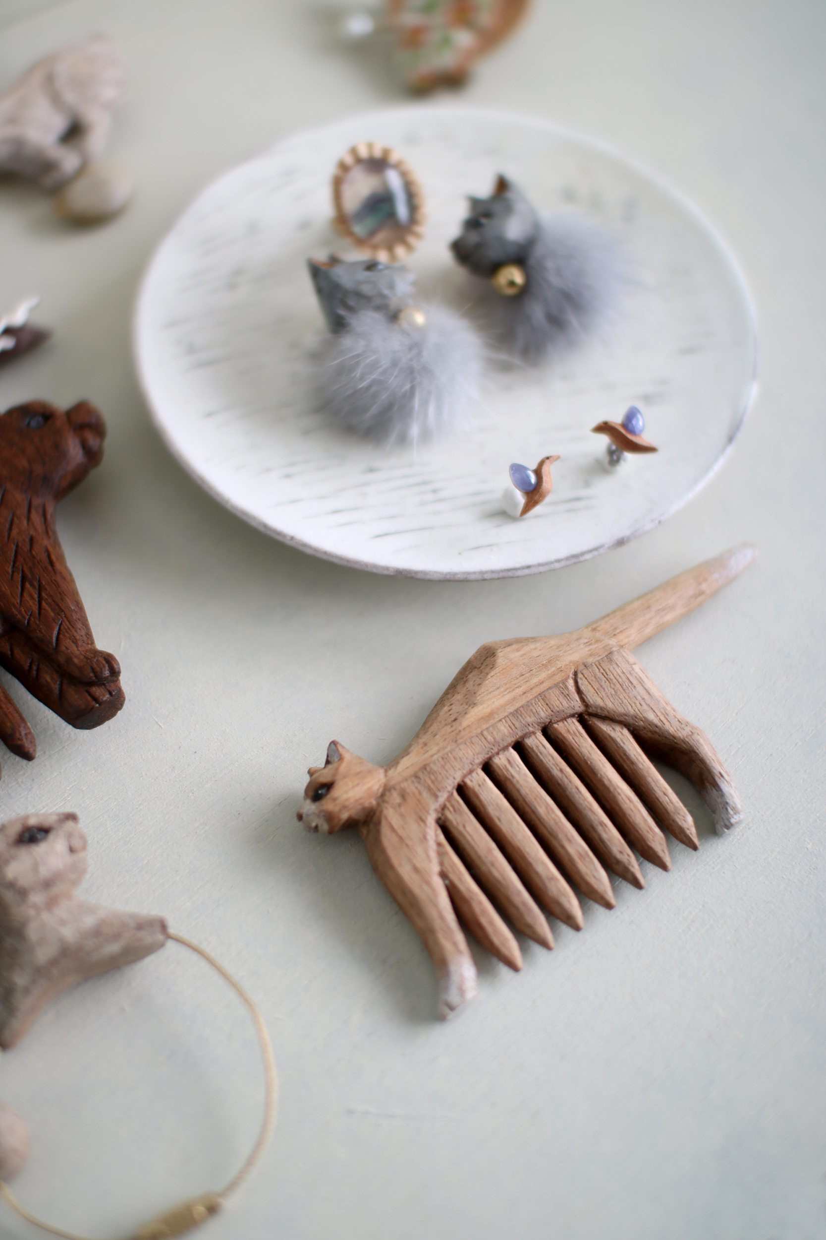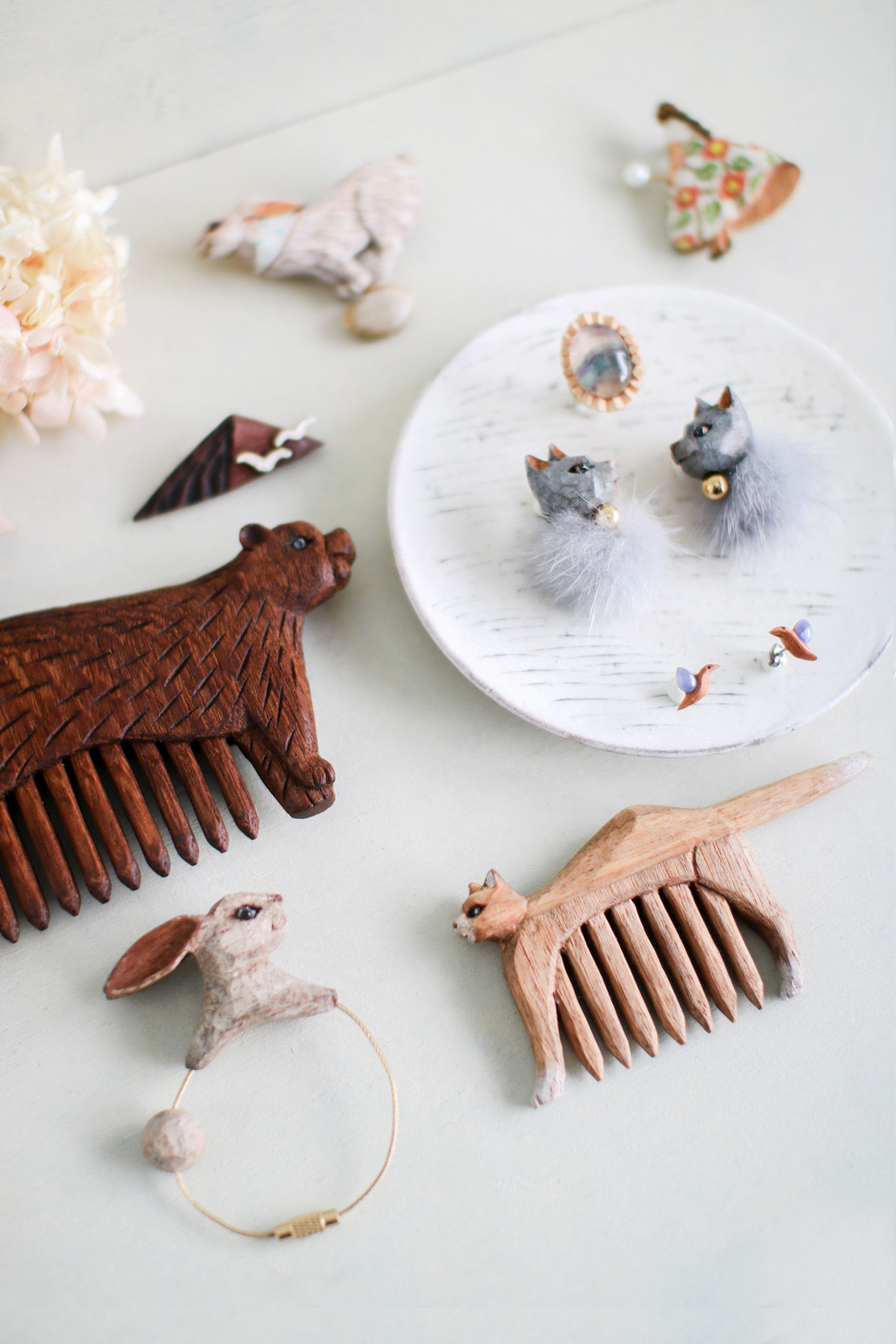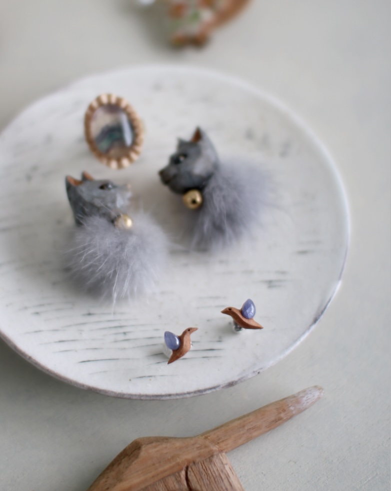 木と天然石やファーなどを組み合わせた耳飾り、リング、ブローチなど、