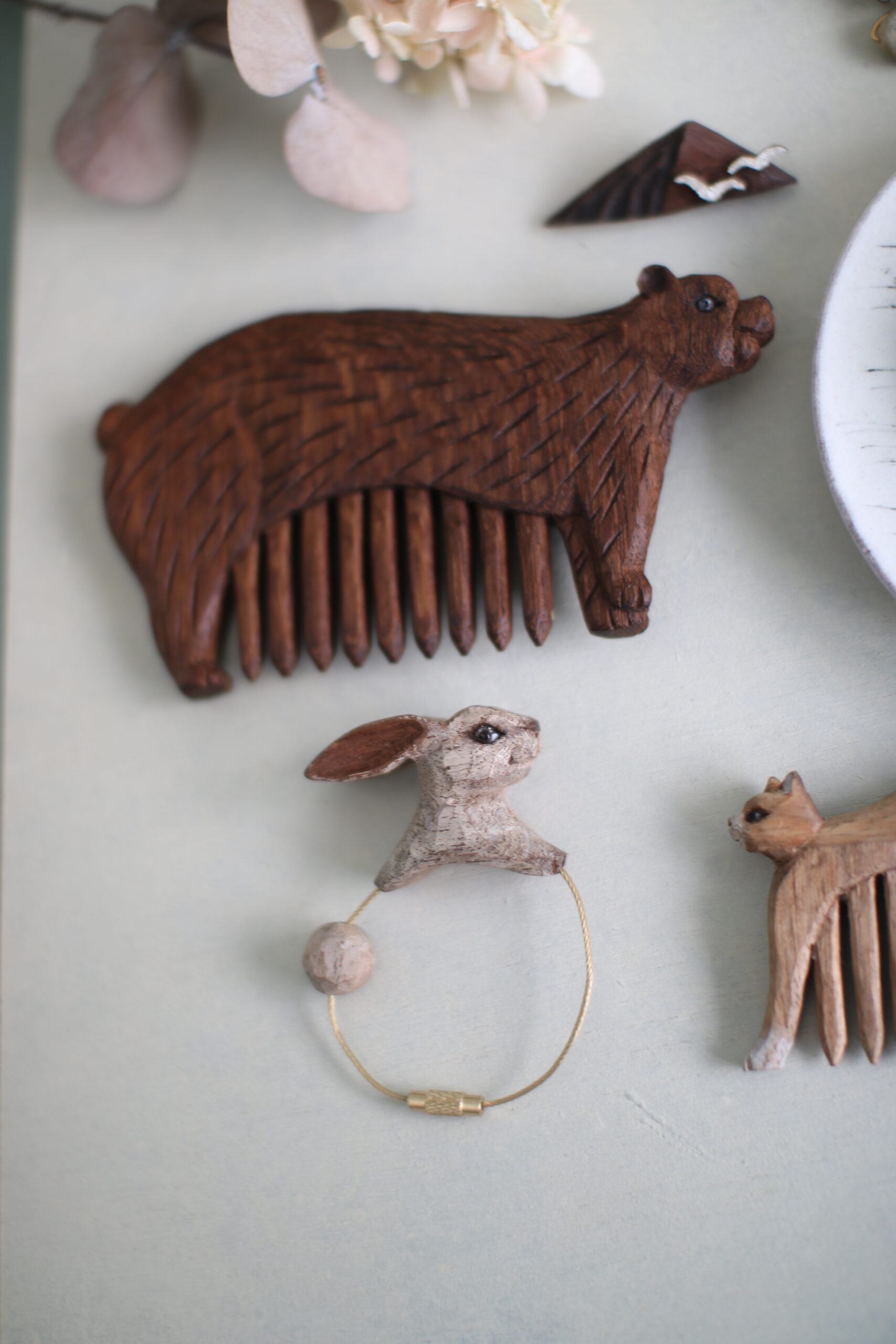 三つ編みの女の子を取り巻く世界をテーマに<木となにか> を組合せた装身具・カバン・オブジェなど幅広く制作。