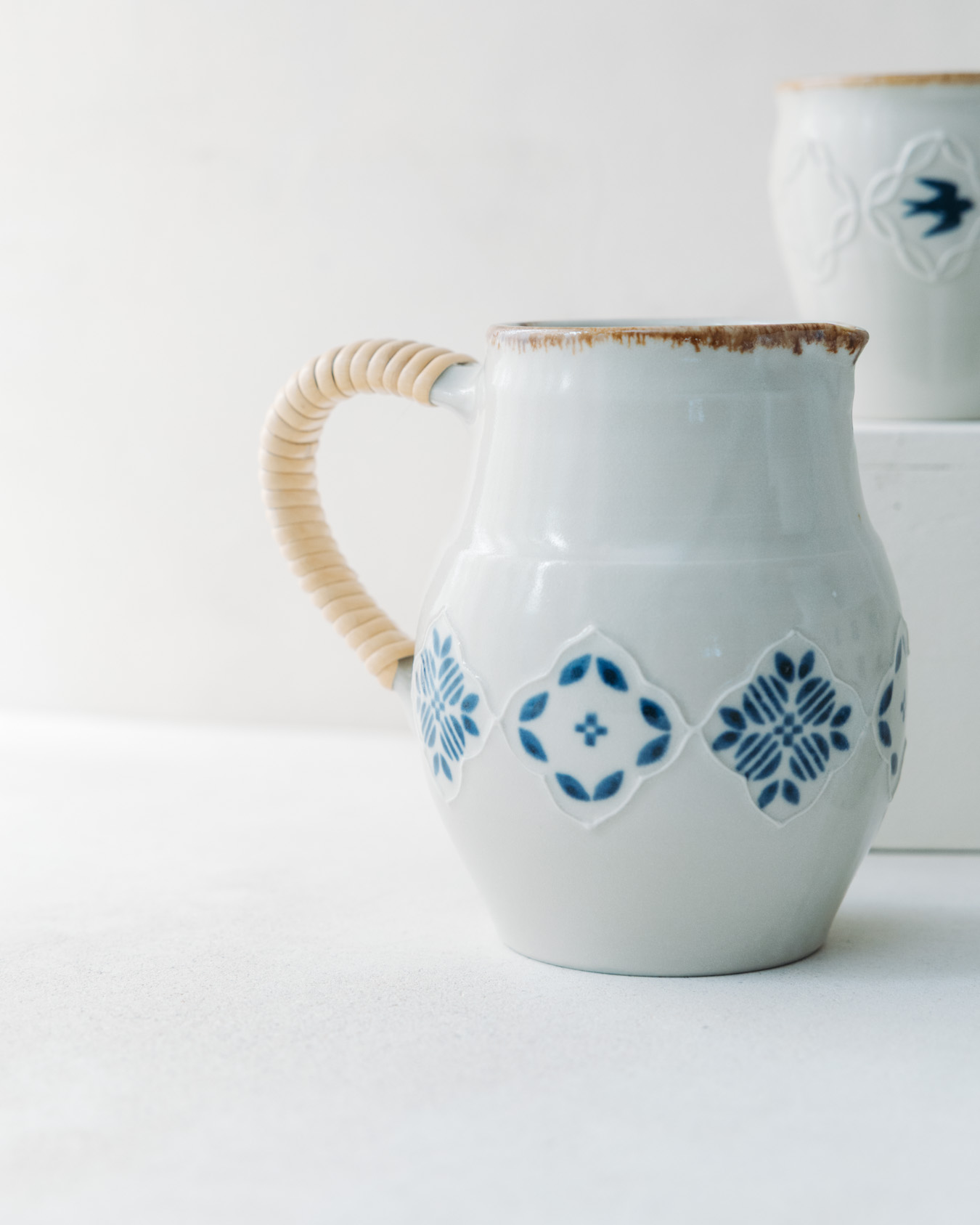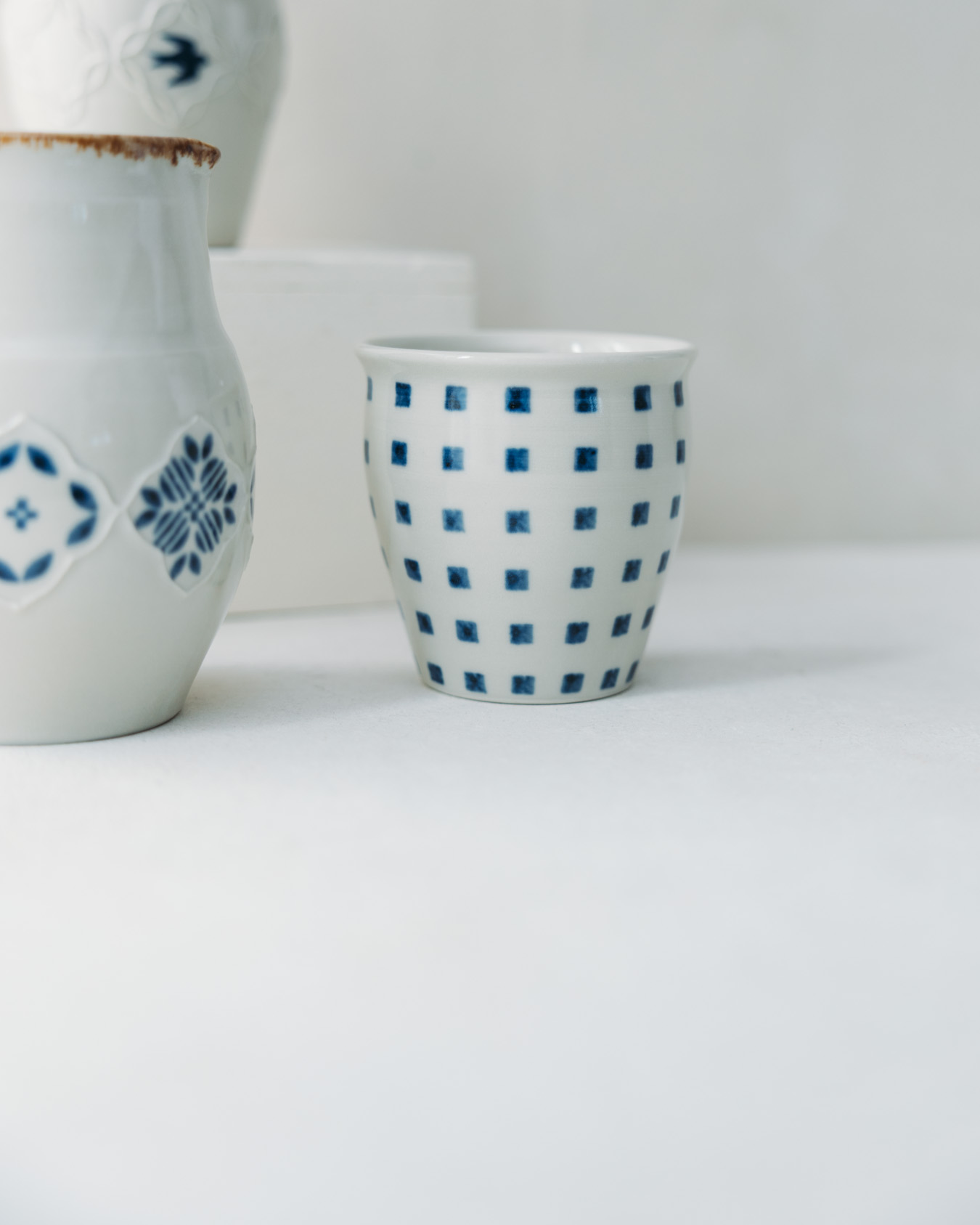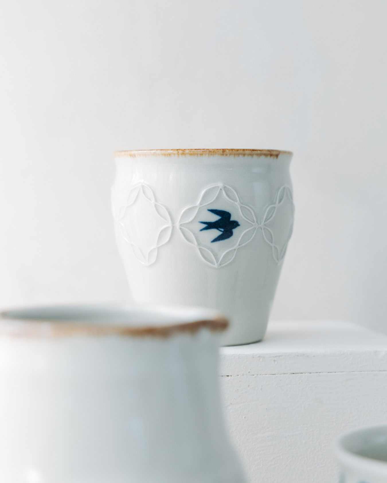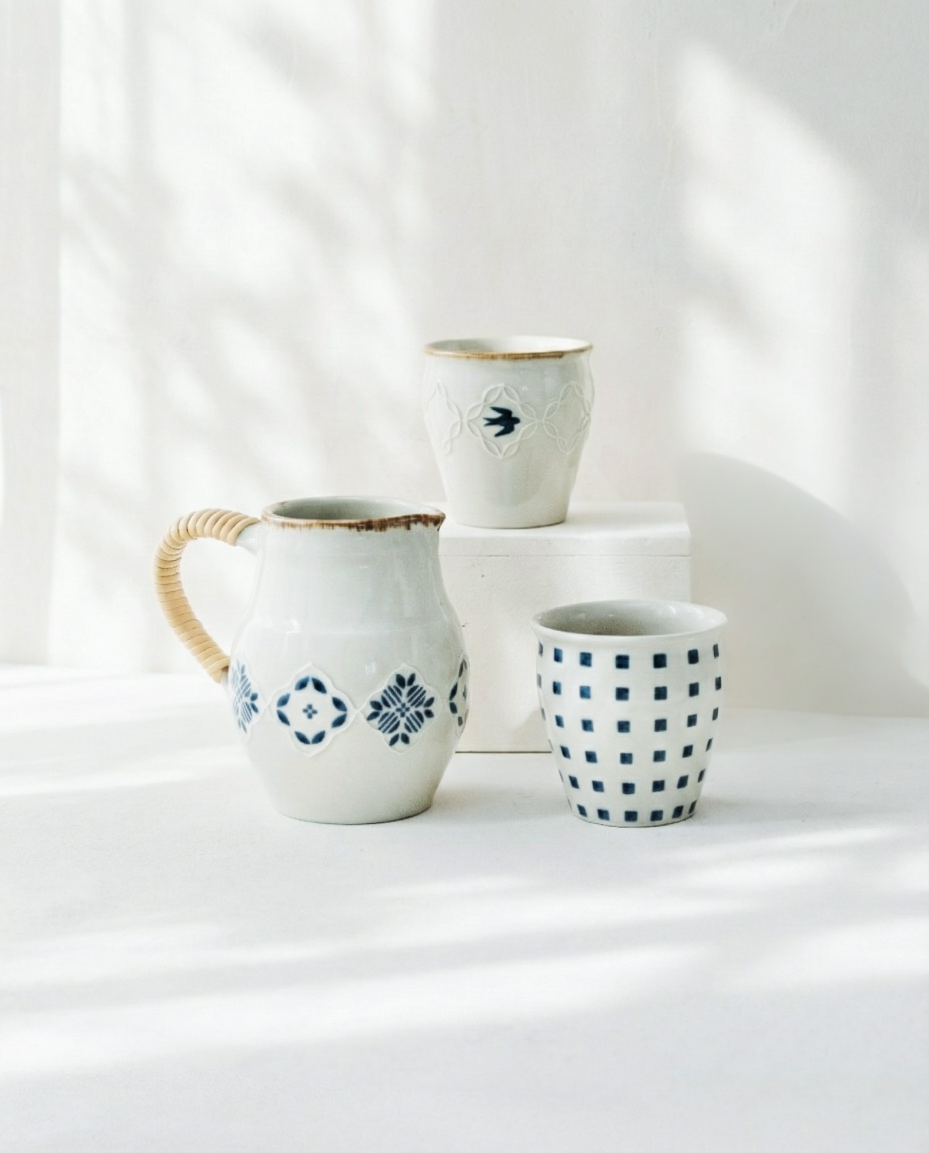 かわいらしい花々や幾何学的な模様が描かれた、表情豊かであたたかみを感じる器たち。