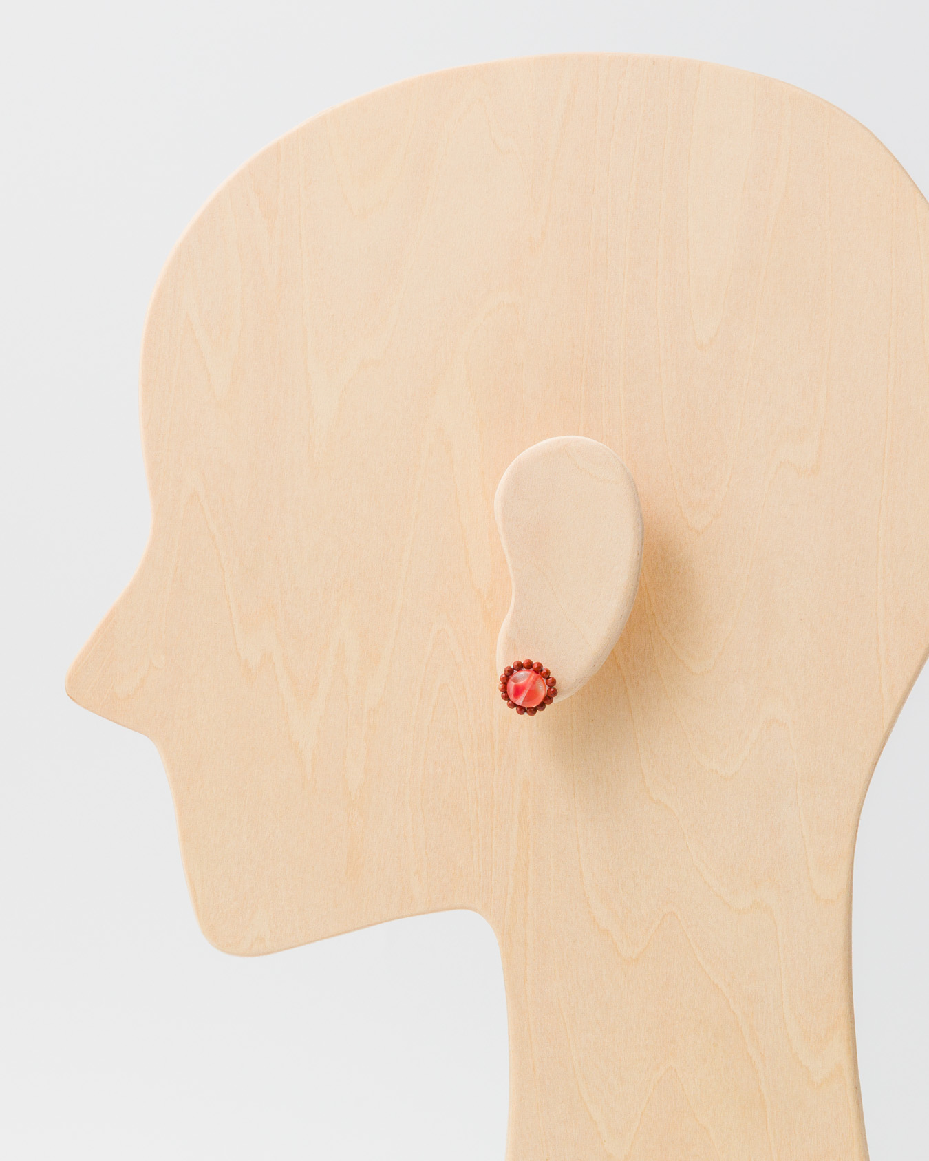 イヤホンで外の音を塞ぎ、赤く色づいた木々を静かに眺める時間をイメージ。中央の艶やかなヴィンテージガラスを繊細なビーズが囲み、甘さを抑えたレッドが装いのアクセントになります。
